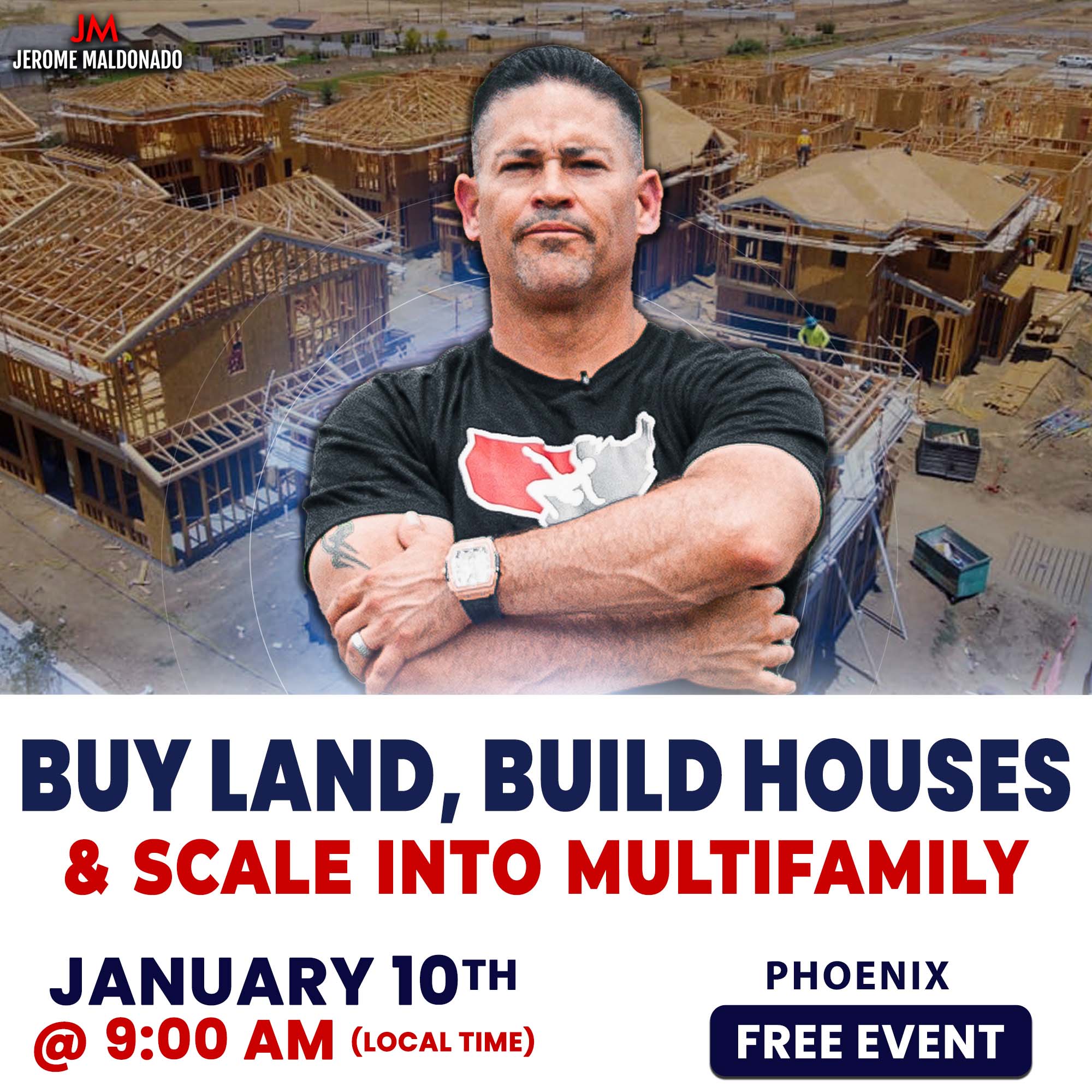 Free In Person Training, where I will teach you how to buy land, build your first house, sell it for a six figure profits, and scale into multifamily.